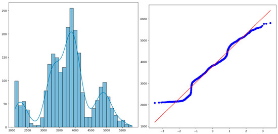 To improve the stability and effectiveness of data modeling, this study first conducted a statistical examination of the CSI 300 Index closing price. As shown in Figure 4, the distribution of the data exhibits multimodal characteristics and deviates from normality, indicating the presence of notable volatility and noise. Accordingly, denoising is necessary to enhance the quality of the input data.