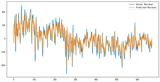 To further address the MHABiLSTM model’s limitations in capturing linear trends, an ARIMA model was applied to its residual sequence (see Figure 6). By extracting the linear trend components from the residuals, the ARIMA model served to correct systematic errors and enhance the overall prediction accuracy.