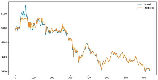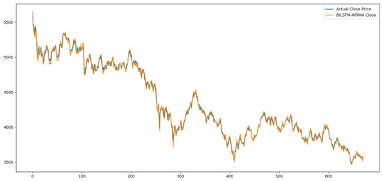 After training and fitting the ARIMA model, its predicted residuals were added to the MHABiLSTM predictions to obtain the final forecasts of the MHABiLSTM-ARIMA hybrid model. A comparison between the predicted values and the actual values on the test set is illustrated in the Figure 7.