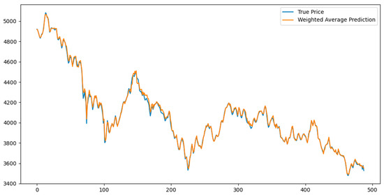 By applying this inverse-error-weighted fusion strategy, the final forecast for CSI 300 stock prices was obtained. Figure 9 illustrates the comparison between the fused predictions and the actual values on the test set, validating the effectiveness of the ensemble strategy in enhancing forecast accuracy and variance explanation.