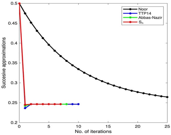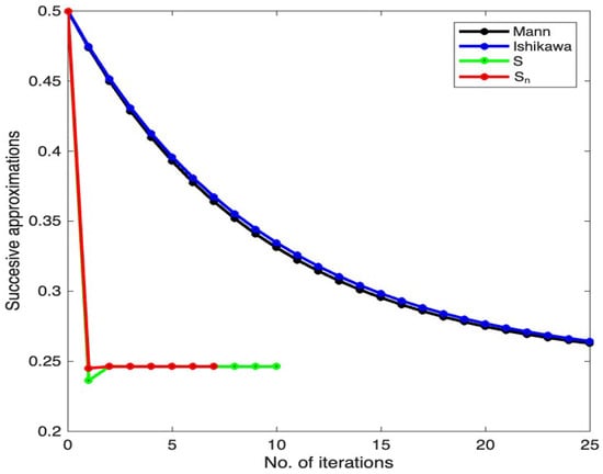 Figure 1 exhibits the results concerning the orbit of when considering the three-step iteration procedure as an alternative to the one-step iterative scheme of Mann or the two-step iterations Ishikawa and S. One can easily notice that the iteration provides a shorter orbit.