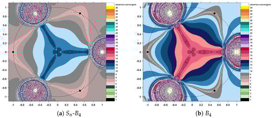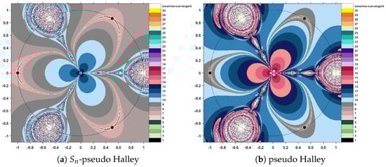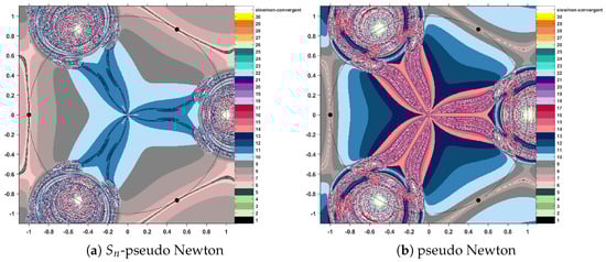 It is easy to notice that the pseudo-Newton method (43) results from running a Picard-type iteration procedure for the pseudo-Newton iteration function . Kalantari suggested the possibility, which was further consistently approached by Gdawiec and Kotarski ([]), of using other types of iteration functions, combined perhaps with more complex iterative schemes, to generate new pseudo-methods for solving the maximum modulus problem. The resulting procedures were called MMP methods. An important starting point on this topic is presented in [].