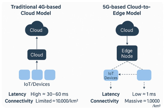 To further clarify the shift from legacy cloud models to next-generation distributed architectures, Figure 2 presents a side-by-side comparison of traditional 4G cloud computing and 5G-powered cloud-to-edge systems. In the 4G model, all data is routed directly from IoT devices to a centralized cloud, resulting in higher transmission delays (30–60 ms) and limited device density (~10,000/km2).