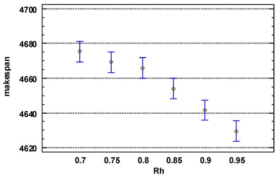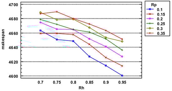 Seen in Table 2, when rh = 0.95 and rp = 0.10, the average value of MS is 4601, which is the best among these makespan values, and the standard deviation is 31.54, which means that the algorithm searches a wider and better solution space by using these two parameters. Further, different parameter combinations, as listed in Table 2, may have a significant impact on the average makespan values, and the analysis results are shown in Figure 2, Figure 3 and Figure 4.