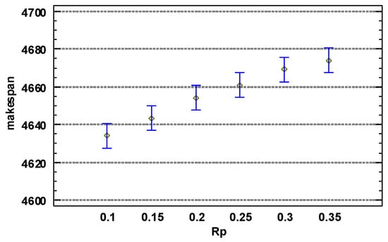 Figure 4 shows the results of a one-way analysis of variance for rp, from which it can be seen that as the value of rp decreases, the solution obtained by the algorithm is improved. When rp is 0.10, the algorithm can obtain the best solution.