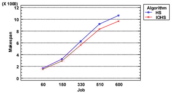 It can be seen from Figure 5 that as the number of jobs increases, the problem becomes more complex, and the makespan values obtained by the algorithms increase. However, under the same number of jobs, the IOHS algorithm outperforms the HS algorithm.