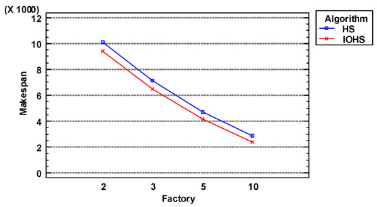 Figure 6 shows that, as the number of factories increases, the number of jobs in each factory becomes smaller, and the resulting makespan values obtained by the algorithms decrease. Under the same number of factories, the IOHS algorithm outperforms the HS algorithm.