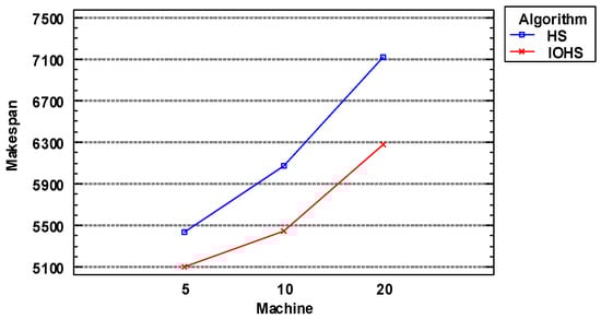 It can be seen from Figure 7 that, as the number of machines increases, the makespan values obtained by the algorithms increase. Under the same number of machines, the IOHS algorithm outperforms the HS algorithm.
