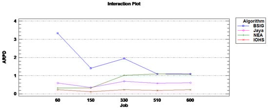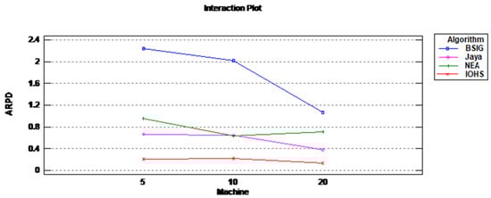 Figure 8 shows that, as the number of jobs increase, the ARPD values obtained by BSIG slightly decrease, while the ARPD values obtained by NEA algorithm increase. It indicates that, as the number of jobs increases, the BSIG algorithm can expand its search range and find better solutions, while the NEA algorithm becomes worse. As the number of jobs increases, the ARPD values obtained by the Jaya and IOHS algorithms have no significant changes. It is obvious that, regardless of the number of jobs, the IOHS algorithm gives the best performance of the three algorithms.
