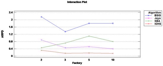 Figure 9 shows that, as the number of factories increases, the ARPD values obtained by the IOHS and Jaya algorithms both show a downward trend, while those obtained by the BSIG and NEH algorithms fluctuate. That is, the IOHS and Jaya algorithms are still able to find better solutions when the number of factories increases. It is clear that the IOHS algorithm shows the best performance of the three algorithms under this assumption.