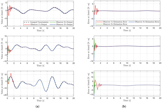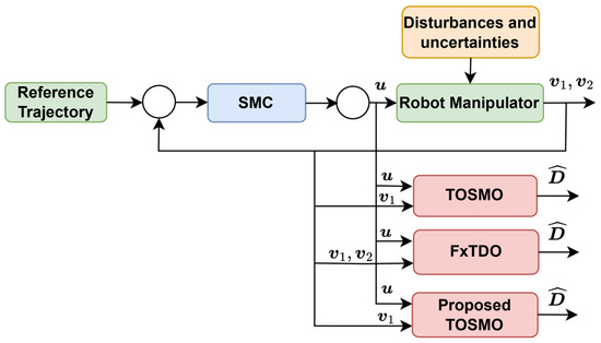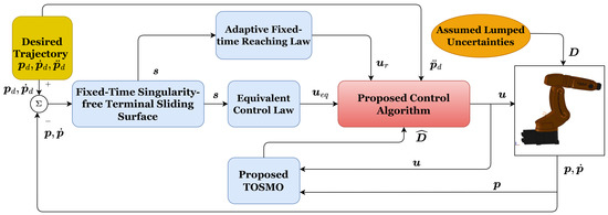 By combining the advantages of fixed-time control (FxTC) theory with the inherent robustness of SMC, fixed-time SMC (FxTSMC) was proposed, making it a widely adopted method for managing nonlinear systems [23,24,25]. These frameworks have proven particularly effective in robotic manipulator control, where reliability and fast, predictable convergence are critical. Building upon fixed-time stability theory, several FxTSMC schemes have been proposed for robot manipulators operating under such challenging conditions [26,27]. These advancements in FxTSMC have significantly contributed to the development of time-constrained tracking strategies. However, due to the inherent nature of SMC, chattering remains a persistent challenge, even within FxTSMC frameworks. To enhance convergence speed and improve applicability in handling uncertainties, nonlinearities, and external disturbances, adaptive fixed-time sliding mode control (AFxTSMC) schemes have been proposed [28]. Moreover, integrating adaptive mechanisms with FxTSMC offers a promising approach to reducing chattering while maintaining fast and predictable convergence. Despite substantial advancements in FxTC, its practical implementation in robotic manipulator tracking control still faces obstacles. One major challenge is the difficulty in handling uncertain dynamics and external perturbations, particularly in the presence of singularities, algebraic loop issues, or when an exact system model is unavailable. While FxTSMC provides strong robustness, its performance can degrade under rapidly varying uncertainties or external inputs. Moreover, its effectiveness is often limited when the system dynamics are not well known or are difficult to model accurately. To overcome these challenges, several estimation and observer-based strategies have been introduced [29,30]. These include methods based on time-delay estimation (TDE) techniques, such as adaptive time-delay control (ATDC) [31], and other approaches [26,32], as well as observer frameworks, including disturbance observers (DOs) [33], third-order sliding mode observers (TOSMOs) [34,35,36], fixed-time disturbance observers (FxTDOs) [37], fuzzy logic observers [38], and neural network observers [39]. Within these frameworks, the observer is responsible for approximating uncertain system dynamics and external perturbations, whereas SMC addresses the residual discrepancies [40]. Consequently, the approximation error from the observer can only be mitigated by selecting an appropriate sliding gain, which directly influences control precision and robustness while also helping to produce smoother control inputs. Fuzzy logic and neural network observers are particularly effective in handling complex and uncertain environments; however, they typically involve higher computational complexity and often lack guaranteed finite-time convergence [41]. FxTDOs provide convergence in fixed time but usually require acceleration measurements, which are difficult to obtain in practice [37,42]. Among the aforementioned observers, TOSMO is considered superior due to its ability to achieve finite-time convergence using only position measurements [43]. Nevertheless, its convergence speed still requires improvement to prevent potential delays in the control system.