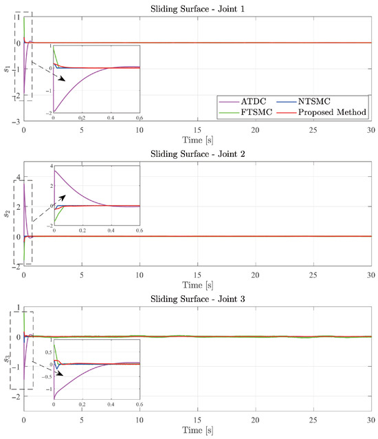 Figure 5, Figure 6 and Figure 7 and Table 2 provide a comparative evaluation of the performance metrics, including convergence rate, accuracy, robustness to uncertainties and external disturbances, and other relevant criteria. Figure 5 illustrates the position tracking of the robot arm in both Cartesian (XYZ) and joint spaces under the four control strategies. While all methods successfully followed the desired trajectory despite modeled uncertainties, there are notable differences in their convergence speed and tracking accuracy results across the approaches. Figure 6 illustrates the evolution of the different sliding mode surfaces.