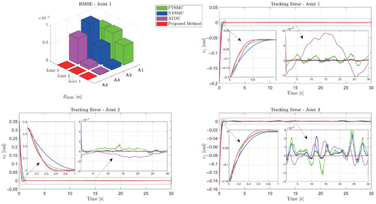 Comparison of RMSE values and time responses of the joint tracking errors for the four control methods.