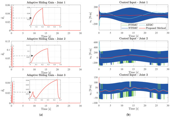Evolution of adaptive sliding gains and comparison of control torques among the four control methods; (a) adaptive sliding gains, (b) control torque signals generated by the four control methods.