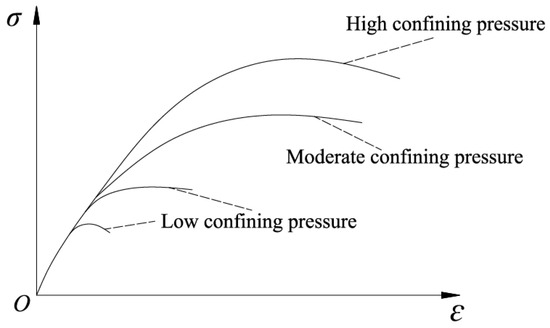 Concrete exhibits plastic flow when subjected to sufficiently high confining pressures. Figure 2 presents the stress–strain curves under varying confinement levels, demonstrating that increased confining pressure.