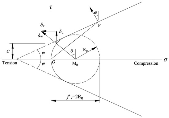 This section assumes that concrete exhibits no tensile resistance, while obeying the Coulomb yield criterion in compression. As depicted in Figure 3, the zero-tension constraint manifests as a tension cutoff circle tangent to the ordinate (τ-axis). The envelope line forms an angle with the abscissa (σ-axis), intersecting the ordinate at a distance c from the origin.