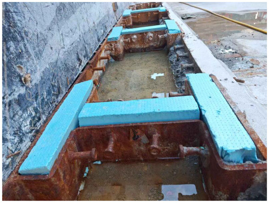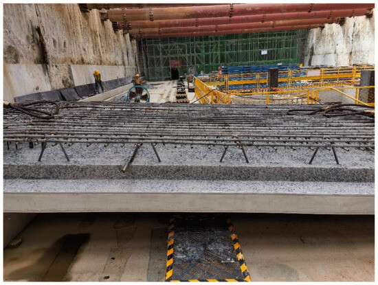 This study focuses on the Chanwan Station of Shenzhen Metro Line 15 for investigation and analysis. As a pivotal node on Shenzhen Metro Line 15—the city’s inaugural loop line (“Shenzhen Loop”)—Chanwan Station is situated in the coastal reclamation area of Qianhai Bay, holding significant engineering and regional strategic value. With a total length of 356 m, the station functions as an interchange hub. Its integrated structure, Chanwan Central Station (interconnected with Chanwan Station), is designed as a three-level underground single-column island platform station. It features a hybrid construction system combining cast in situ concrete with prefabricated elements and will facilitate stacked-island transfers with Metro Line 9. As an overlapped subway station, Chanwan Station is currently being prepared for assembly. Images depicting the precast sidewalls and the reserved interfaces on the base slab are presented in Figure 5 and Figure 6.