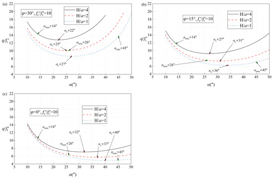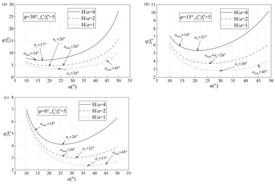 As the angle (where the Coulomb envelope intersects the horizontal axis) decreases, the critical wedge angle corresponding to the upper-bound solution exhibits a gradual increase. Concurrently, the apex of the rigid wedge progressively shifts away from the foundation base of the slab–wall joint, resulting in a geometrically flatter wedge configuration. It is particularly noteworthy that at , when decreases to 15°, approaches asymptotically, converging to the geometrically permissible minimum angle.
