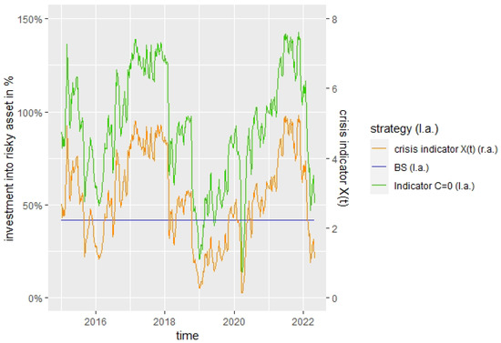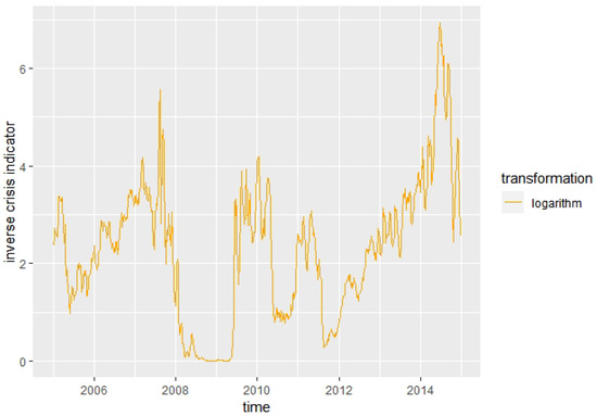Having derived the optimal solution for our general model formulation given in Definition 3, we want to fit our two special cases given by (10) and (11) to data and analyze their characteristics and performance. For this, we use data from 1 January 2005 to 2 May 2022, where we divide the time interval into a part for estimation from 1 January 2005 to 31 December 2014 and the following part for out-of-sample performance analysis from 1 January 2015 to 2 May 2022. The main idea of the numerical analysis consists of the use of the data for the inverse crisis indicator , which we inserted into the model from Definition 3. The construction of data used for this inverse crisis indicator is introduced in Section 4.1. The time periods and frequency of the data points are chosen according to the availability of the crisis indicator.