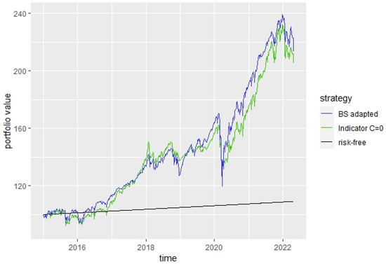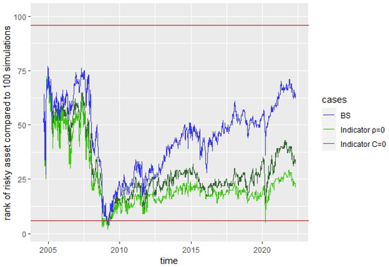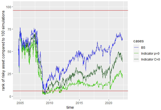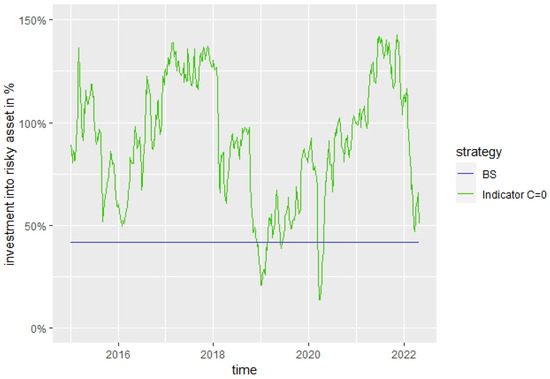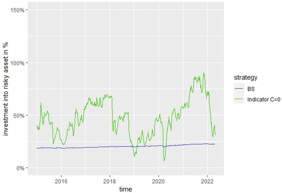 For the case , the solution only consists of the mean–variance part, which is nonetheless stochastic due to its just-mentioned dependence on in the model formulation. In addition, we obtain for the power utility case for suitable choices of the other parameters. In this case, the CPPI part is equal to one, so the investment into the risky asset is not scaled down to guarantee a floor, as the floor is set to zero.