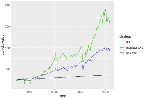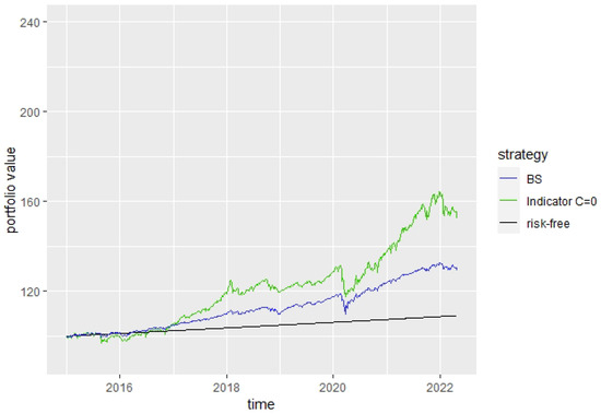 With respect to the modeling of crisis periods, Markov-switching models are especially discussed in the literature. Evidence for the existence of different market regimes in equity and currency markets is, e.g., in [3]. Portfolio optimization results in Markov-switching models can be found, e.g., in [4,5]. Ref. [6] uses model predictive control for dynamic portfolio optimization based on forecasts of the mean and variance of financial returns resulting from a hidden Markov model with time-varying parameters. Ref. [7] analyzes a defaultable market with parameters depending on the market regime given by a Markov process. Ref. [8] empirically indicates an outperformance of portfolio optimization based on a Markov-switching model compared to a BS framework together with significantly reduced risk measures. To the best of our knowledge, it is only possible to derive closed-form solutions if the Markov-switching regimes are observable. In reality, however, these regimes are often not observable, but they can be estimated. Ref. [9] uses economic variables to estimate regimes for use in asset allocation. The use and impact of regime-switching models is presented in [10,11], which use observations in directional changes to identify normal and abnormal market regimes. In [2], three different market phases are identified and a model is constructed to forecast probabilities for each market phase.