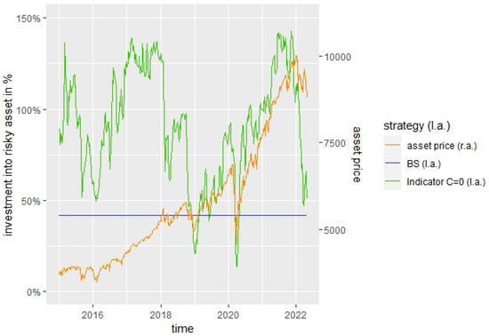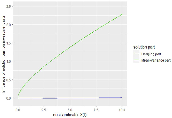 with as given in (A30). The structure of the last line corresponds to the solution of the more general case of several stochastic factors, including a stochastic interest rate in [20]. The first summand in the parenthesis is called the mean–variance part as it is the proportion of the excess return of the risky asset to its variance, while the second part is called the hedging part, as it is an additional part influenced by the stochastic process . Note that, in our case, the stochastic factor also influences the mean–variance part, as it is part of the drift and volatility of the risky asset in the model formulation given in Definition 3.