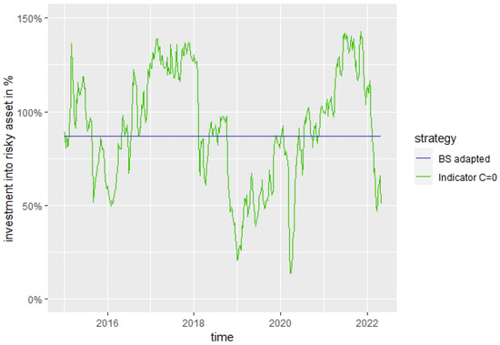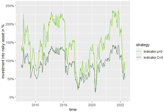 Thus, it can be considered as a generalization of a CPPI strategy, where the multiplier depends on and is therefore stochastic and not constant. This stochastic part allows the strategy to use the information of the market indicator to adapt its investment into the risky asset. The front part has the effect of a CPPI strategy, where it only invests proportional to the cushion to guarantee the floor F at time T. This part of the strategy appears due to the choice of a HARA utility function as is the case for the standard CPPI strategies. In the extreme case, if, due to a crash, the cushion becomes very small, the investment into the risky asset would also be very small such that the portfolio value being close to is mostly invested into the risk-free asset, guaranteeing a final value of at least F. Also, we see that the higher the guaranteed floor, the smaller the factor for the investment into the risky asset becomes, which means that the optimal strategy becomes more conservative to guarantee the floor value F at time T.