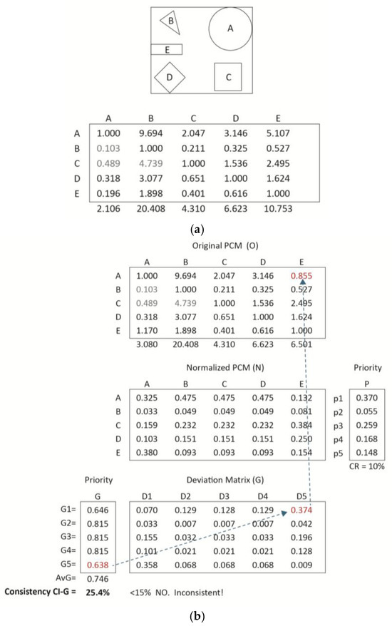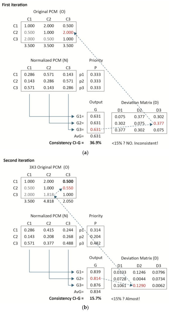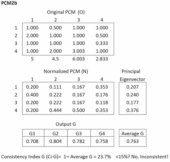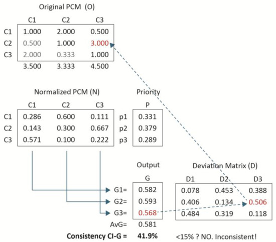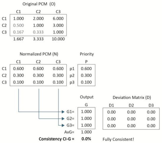 where denotes the arithmetic mean of the compatibility indices G calculated for each column of the normalized PCM, denoted as matrix N, relative to the corresponding priority vector P. The results are presented in the “Output G” section in Figure 1. The calculation steps are explained in the following.