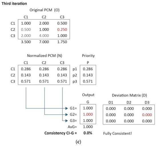 - Finally, from the deviation matrix, identify the highest value “j” in column “i”. This pair (i,j) corresponds to the cell that should be revised in the original PCM. If the identified cell is below the diagonal, its reciprocal value (above the diagonal) should be considered.