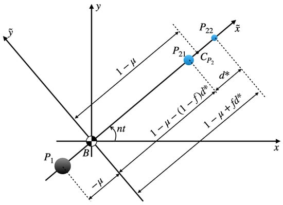 The parameter f of the model not only determines the mass of each pole from the mass of primary II but also influences the distance of each pole to the center of mass of primary II. To decouple these two influences of the parameter f from the dipole and to analyze only the effect of mass variation in the poles and by the variation in this parameter, the standard distance (geometric reference) of the model is adopted as the distance between the centroids (geometric centers) of the primaries. As shown in Figure 2, the synodic abscissa in canonical units of the dipole poles are and .