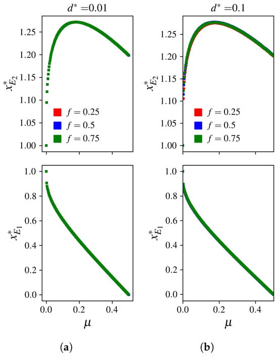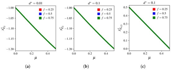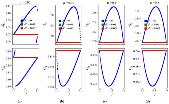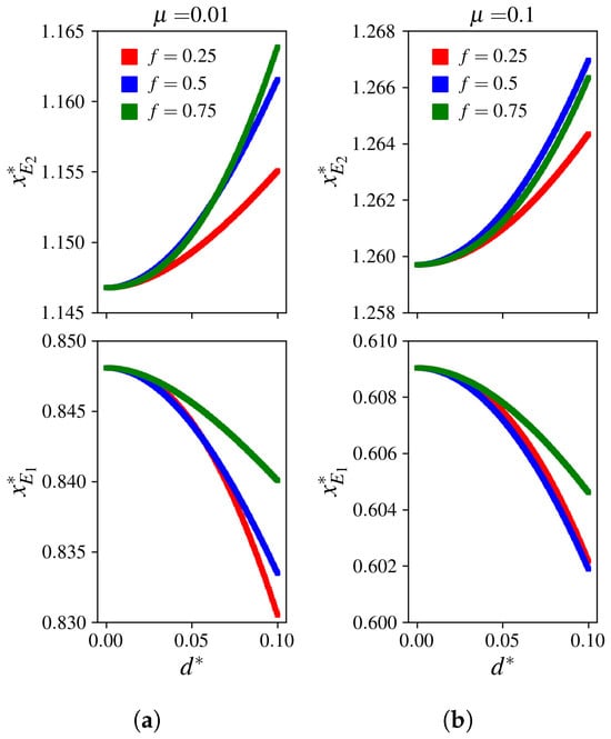 Figure 7 depicts the variations in the synodic abscissa of equilibrium points and as the dipole mass distribution parameter f changes, for different values of (0.001, 0.01, 0.1, and 0.3). Panel (a) illustrates the effects of the mass distribution of the dipole when . The equilibrium points respond distinctly to variations in f, emphasizing their stability. Panel (b) shows results for , where the sensitivity of and to changes in f is highlighted. Panels (c) and (d) represent higher values of (0.1 and 0.3, respectively). As f increases, the movement of the equilibrium points is more pronounced, indicating a complex interplay between mass distribution and the dynamics of the asteroid system. These figures collectively illustrate the dynamic behavior of equilibrium points in a binary asteroid system influenced by variations in mass distribution and geometric parameters, providing valuable insights into their stability and motion.