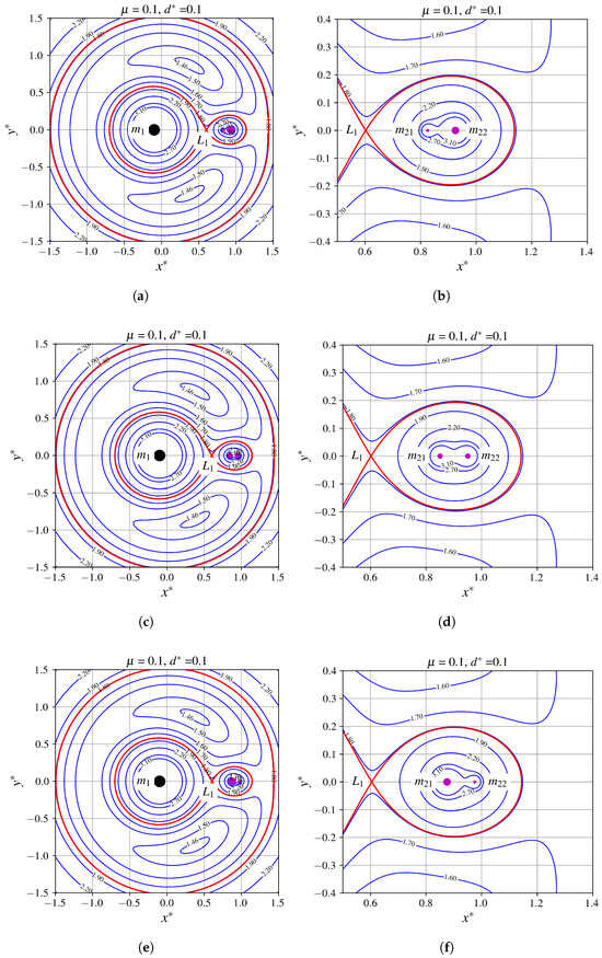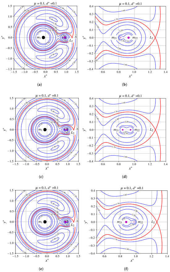 Figure 8a–f shows the zero-velocity curves associated with for the configuration , . These curves intersect at the equilibrium point , located between the primaries, and, for this reason, is called the first point of contact between the ovals surrounding and the dipole. Figure 8b,d,f also shows in greater detail the plot of zero-velocity curves associated with in the vicinity of the dipole. There is also a second zero-velocity curve associated with surrounding the two primaries, as can be seen in Figure 8a,c,e. Figure 9a–f show the zero-velocity curves associated with for the configuration , . The zero-velocity curves associated with this value for the Jacobi constant intersect at the equilibrium point , to the right of the dipole. This equilibrium point is the second point of contact of the system and, in particular, allows the contact of the oval surrounding the primaries to the oval external to the binary asteroid system. Figure 8b,d,f also show in greater detail the plot of zero-velocity curves associated with in the vicinity of the dipole.