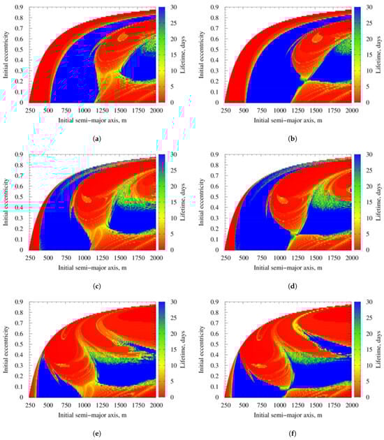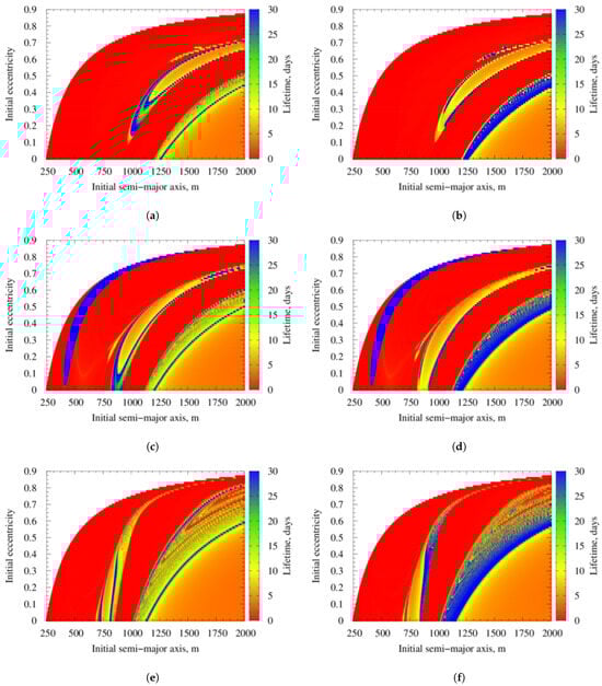 From the analysis of the grids in Figure 10 for direct motion of the spacecraft with respect to the primary II, it is observed that, in all the configurations considered for the value of the mass distribution parameter f of the dipole and for the initial position of the Sun relative to the center of mass of the binary asteroid system, the spacecraft’s initial positioning conditions prevail that allow it only a short direct motion survival in that system (up to approximately 10 days). The smaller its initial semi-major axis, the closer the spacecraft is to primary II, modeled as a mass dipole. In addition, larger initial eccentricities associated with larger semi-major axis initial values also place the spacecraft initially closer to this primary. In the grids in Figure 10, the existence of certain regions, of lesser extension, which present themselves as sets of initial conditions for the direct motion of the spacecraft that provide it with a longer survival time, reaching up to the initial 30 days of simulation, is also verified. For the three cases of values assumed for the parameter f, it can be seen, from the grids in Figure 10, that the spacecraft has several initial conditions in direct orbit that provide the first 30 days of survival in the system for the configuration in which the dipole is symmetric regardless of the initial position of the Sun. A symmetric dipole has a symmetric gravitational potential field. In contrast, an asymmetric dipole has a gravitational potential field with asymmetry in relation to the center of mass of the primary II, with greater intensity around the pole of greater mass. Consequently, such asymmetry in the distribution of the gravitational potential in the plane of motion of the spacecraft for the cases of and leads the vehicle to present, in general, greater difficulties in sustaining, for a longer time, a direct motion initiated around the mass dipole. When considering the initial position of the Sun relative to the asteroid system, it appears that, for cases where the Sun departs from its apoapsis (Figure 10b,d,f), there is a larger number of initial conditions that allow for the survival of direct motion of the spacecraft for the first 30 days of simulation, compared to cases where the Sun is considered from its periapsis (Figure 10a,c,e). Since the Sun’s relative orbit to the asteroid system is eccentric, the Sun will induce greater perturbations by the pressure of solar radiation on the spacecraft’s direct motion in the case where the Sun is taken from its periapsis, compared to the case where the Sun is taken from its apoapsis. Such perturbations by the solar radiation pressure lead, then, to a reduction in the initial conditions for the direct motion of the spacecraft and a longer survival time for this motion in the asteroid system.
