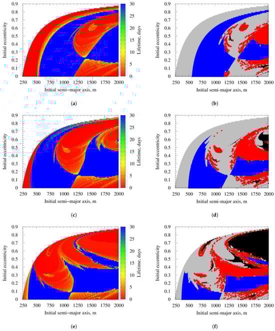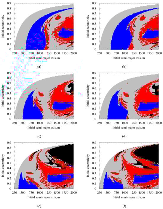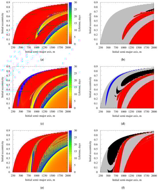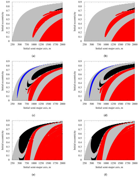 Grids (maps) of conditions for a spacecraft in initial Keplerian osculator direct orbit () around the dipole without the effect of solar radiation pressure. In (a,b), dipole with ; in (c,d), dipole with ; in (e,f), dipole with . In (a,c,e), only the first 30 days of the integration period are considered; in (b,d,f), the entire integration period of 500 days is considered. In (b,d,f), blue represents survival for 500 days, black represents collision with primary I, gray represents collision with primary II, and red represents escape.