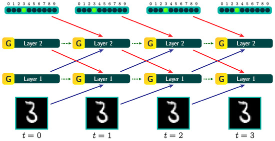where and are the forward and backward weights of the i-th layer, respectively, is the bias of the i-th layer and is a momentum coefficient used to transfer information between time steps (green arrows in Figure 2), consequently avoiding biphasic oscillations. The nice property of such a network architecture is that the weights of all layers can be updated in parallel. Even though this might be very useful when using analog hardware or powerful graphic cards with small training batch sizes, our implementation currently does not take advantage of this property.