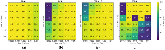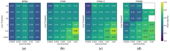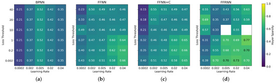 Sensitivity analysis of the accuracy on the MNIST dataset of (a) BPNN, (b) FFNN, (c) FFNN+C and (d) FFRNN with respect to the learning rate and loss threshold () hyperparameters. The networks were trained to minimize for 60 epochs. The BPNN does not use the loss threshold hyperparameter, so the values in each column are equal for all rows.
