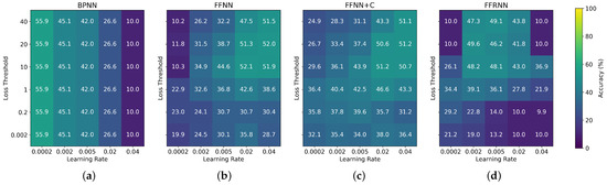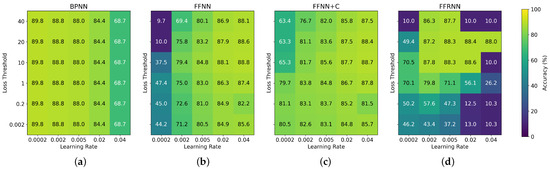 Sensitivity analysis of the accuracy on the CIFAR-10 dataset of (a) BPNN, (b) FFNN, (c) FFNN+C and (d) FFRNN with respect to the learning rate and loss threshold () hyperparameters. The networks were trained to minimize for 60 epochs. The BPNN does not use the loss threshold hyperparameter, so the values in each column are equal for all rows.