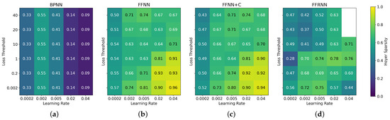 Sensitivity analysis of the mean Hoyer sparsity of all layers of (a) BPNN, (b) FFNN, (c) FFNN+C and (d) FFRNN with respect to the learning rate and loss threshold () hyperparameters. The heatmap shows the sparsity of the model after training with MNIST dataset. The BPNN does not use the loss threshold hyperparameter, so the heatmap is equal across all rows. The white cells indicate that the training of the model failed to converge in the given configuration.