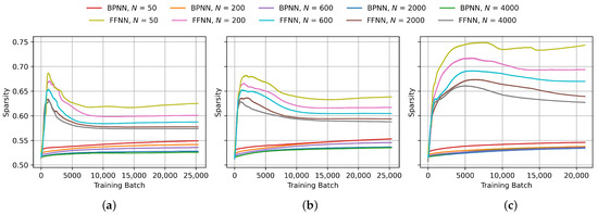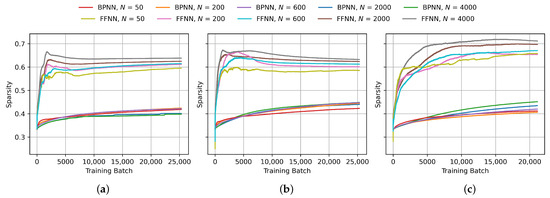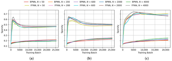 Progression of Hoyer sparsity of the weight matrices during BPNN and FFNN training on (a) MNIST, (b) FashionMNIST and (c) CIFAR-10 with different layer sizes. N indicates the number of neurons in each of the two hidden layers.
