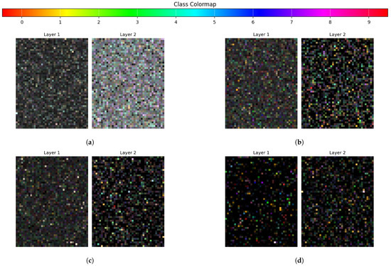 Prior studies [7,9] have shown that FF networks exhibit sparse activations when inferred. Our experiments support these findings, as demonstrated by Figure 13, which shows sparse activations when the same single sample from the MNIST dataset is processed by all of the implemented networks. The activation maps are normalized on a per-layer basis. It can be seen that all of the FF networks exhibit higher activation sparsity compared to the BPNN, as witnessed by a larger number of dark pixels in the FF models’ activation maps.