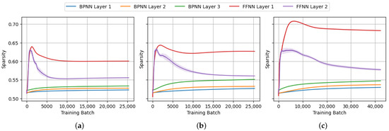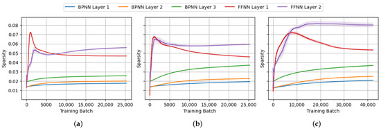 The structural sparsity for all of the fully trained FFNN and BPNN is presented in Table 3. The mean and standard deviation of 10 independent runs with different seeds are reported. It can be seen that the training of the FFNN forms sparser weight matrices in all scenarios with respect to all four sparsity metrics. The standard deviation is orders of magnitude lower than the mean, which suggests that random weight initialization has no major effect on final weight sparsity. The imbalance in how much each layer contributes to the network’s function in FFNNs leads to greater differences in structural sparsity across layers, compared to BPNNs.