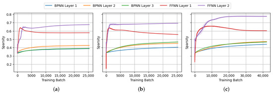 The progression of Hoyer sparsity of the weight matrices during BPNN and FFNN training on (a) MNIST, (b) FashionMNIST and (c) CIFAR-10.