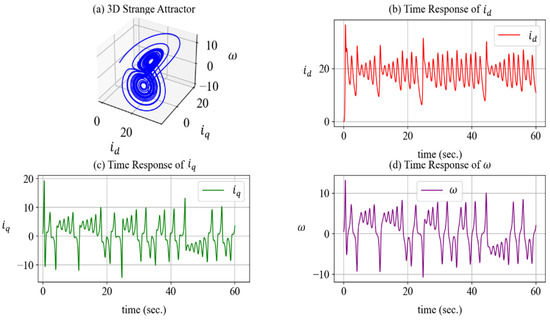 When , and the initial values , IFOPMSM (4) exhibits chaotic behavior, as shown in Figure 1. In general, chaotic behavior in motor systems is considered to have a negative impact on the performance of dynamic systems.