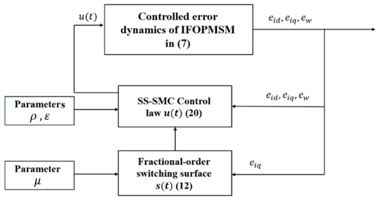 Based on the above discussion, the SS-SMC system architecture for robust angular frequency control of IFOPMSMs is summarized in Figure 2. As shown in Figure 2, the switching surface is first designed according to Equation (12) using the selected parameter . Then, the SS-SMC law is designed according to Equation (20) using the chosen parameters and . Finally, is fed into the system to achieve robust angular frequency control of the IFOPMSM.