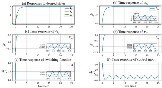 In the following numerical analysis, we first set , i.e., . Figure 3a–f, respectively, illustrate the responses of the system states, tracking errors, sliding surface , and control input . In the case of shown in Figure 3, the discontinuous controller drives the IFOPMSM states to the desired values ,, as expected. However, noticeable chattering occurs in the state responses, the sliding surface, and the control input. This chattering greatly reduces the accuracy of the system’s state responses.