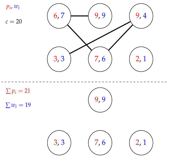 (Top) An example of a KPC instance is presented, where for each item the profit is indicated in red and the weight in blue, and edges represent conflicts. The total capacity c is 20, as indicated. (Bottom) An optimal solution with a total profit of 21 and a weight of 19 is represented. Observe that no conflict is violated by the given solution, since for each pair of conflicting items, at most one is selected.