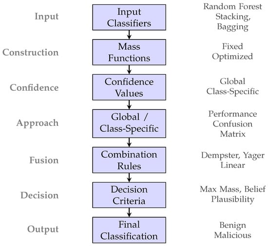 The Dempster–Shafer theory [] provides a mathematical framework for evidence combination and uncertainty quantification, making it valuable for malware detection in the presence of conflicting evidence. The application of DST involves three key steps: defining mass functions, selecting combination rules, and establishing decision criteria.