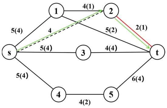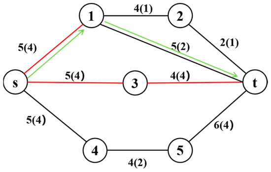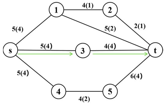 By leveraging backup links, the defender can substantially reduce the shortest path length after an attack. This concept is illustrated with a simple example below. Consider the network shown in Figure 1, where the defender attempts to transmit a message from node  to node . Each link is labeled with its transmission delay, and the defender’s objective is to minimize the message delivery time. Parenthetical values indicate the increased delays for traversing links when the links are attacked. The attacker’s goal is to maximize the shortest message delivery time. Before any attack, the shortest transmission path of the network is  → 3 →  (shown as a green solid line), with a total delay of nine. Then, as shown in Figure 2, when the attacker is allowed to interdict up to three links, the optimal attack strategy (marked by red solid lines) intercepts links (, 1), (, 3), and (, ). In this context, the defender’s shortest available path becomes  → 1 → , resulting in a total delay of 14. Suppose the defender has preconfigured a protected backup link (, 2) with a transmission delay of four, as shown in Figure 3. Since this link cannot be attacked, the attacker’s best strategy shifts to targeting (2, ). Consequently, the defender’s new shortest path becomes  → 2 → , with a total delay of 7, demonstrating how backup links can halve the post-attack delay from 14 to 7.