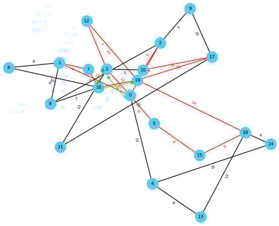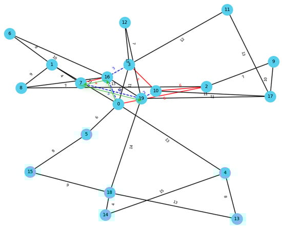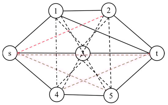 Particularly, for the random generation process, a subset of candidate backup links is randomly selected and designated as backup links. This promotes diversity in the initial population. We define a parameter  to control the proportion of candidate backup links to be selected as backup links. For the path-based generation, we define candidate backup links that are connected to either the source node or the target node as key links. These links are likely to have a higher impact on path recovery. During the construction of each individual in this part of the population, a random number of key links is selected. This process continues until half of the initial population is generated using this strategy. Figure 4 illustrates the concept of key links, in which solid black lines represent the original network, dashed lines represent candidate backup links, and red dashed lines indicate key links used during the initial solution generation process. Furthermore, during initial solution generation, the total resource consumption of the selected backup links must not exceed the available resource constraint, ensuring that each solution is feasible with respect to the resource limits.
