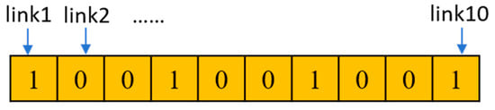 To facilitate computation, the solution is represented using a binary encoding scheme, where the length of the binary vector corresponds to the number of candidate backup links. Each bit in the vector indicates whether a backup link is selected (marked by 1) or not selected (marked by 0). In the example shown in Figure 5, the solution includes 10 candidate backup links, with selected links marked by 1 and non-selected links by 0.